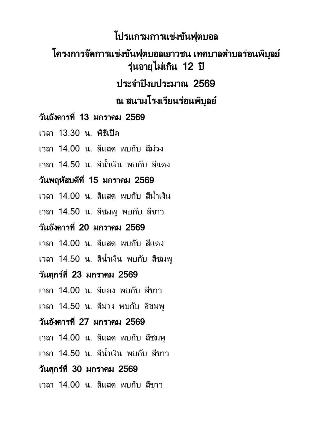 ขอเชิญชม การแข่งขันฟุตบอลเยาวชน เทศบาลตำบลร่อนพิบูลย์  รุ่นอายุไม่เกิน 12 ปี ประจำปีงบประมาณ  2569 วันที่ 13 มกราคม -  เดือน กุมภาพันธ์ 2569  เริ่ม วันอังคารที่ 13 มกราคม 2569 เวลา 13.30  น. พิธีเปิดการแข่งขัน ณ สนามโรงเรียนร่อนพิบูลย์