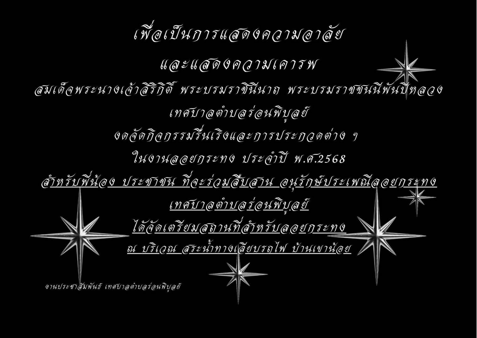 1 กองการศึกษา เทศบาลตำบลร่อนพิบูลย์ เพื่อเป็นการแสดงความอาลัย และแสดงความเคารพ สมเด็จพระนางเจ้าสิริกิติ์ พระบรมราชินีนาถ พระบรมราชชนนีพันปีหลวง เทศบาลตำบลร่อนพิบูลย์ งดจัดกิจกรรมรื่นเริงและการประกวดต่าง ๆ งานลอยกระทง ประจำปี พ.ศ.2568 สำหรับพี่น้อง ประชาชน [ 27 ต.ค. 2568 ]2