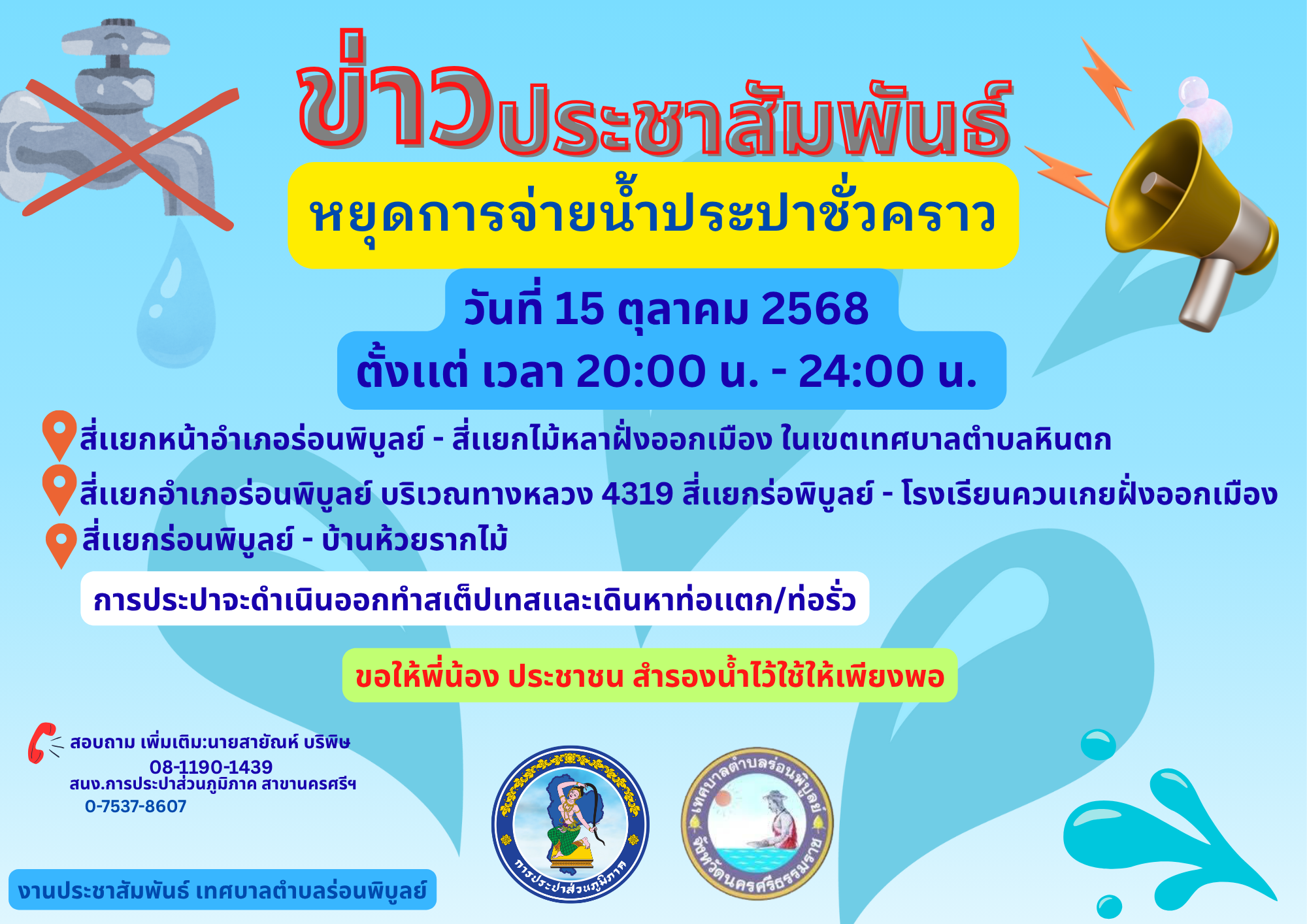 1 การประปาส่วนภูมิภาค สาขานครศรีธรรมราช แจ้งข่าวหยุดการจ่ายน้ำประปาเป็นการชั่วคราว [ 14 ต.ค. 2568 ]3